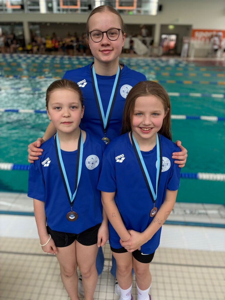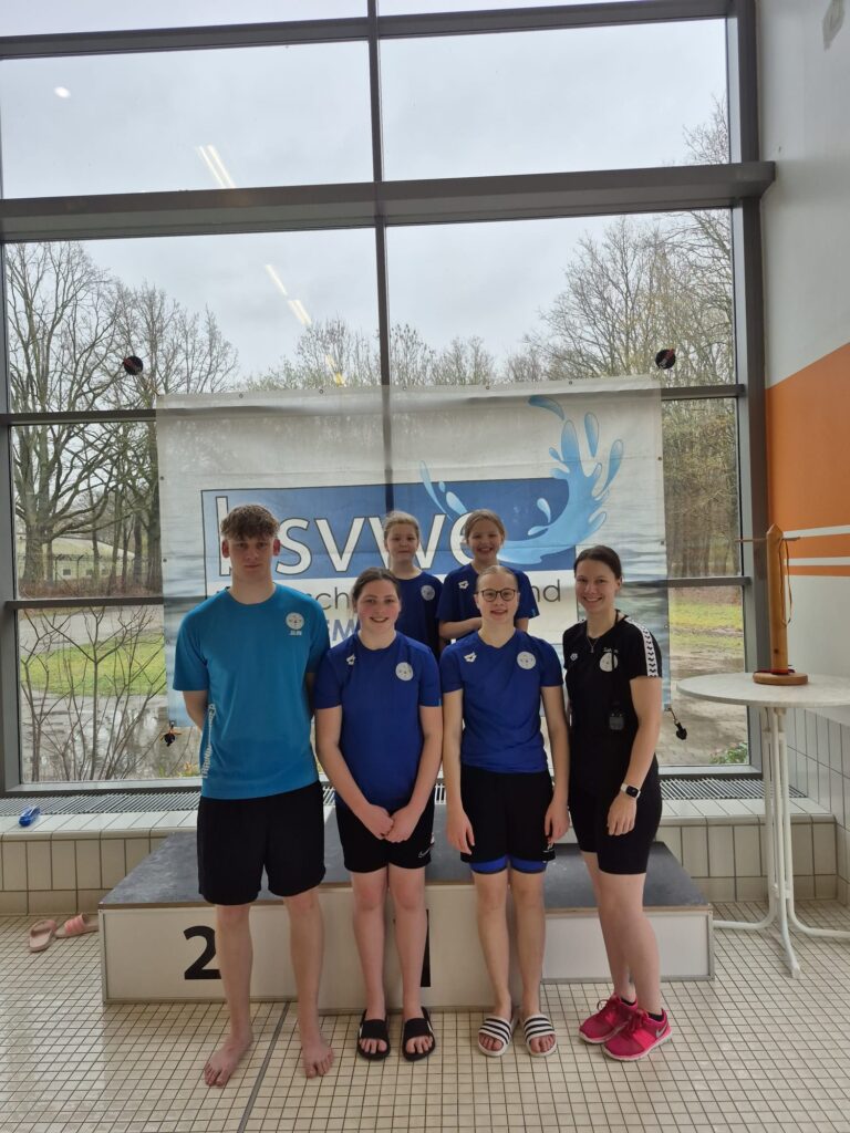 Leider erkrankten Fiona Aehlen und Richard Menke, sodass sie nicht antreten konnten. Also starteten wir insgesamt 26 mal auf der 50m Bahn. Mit dabei waren Hannah Wewers, Lana Bollmer, Jule Müller, Isabell Nakken, Johanna Warmbold, Julian Schnieders, Marlon Bernzen sowie Stella Popovic. Hannah und Lana konnten sich gegen ihre Konkurrenz durchsetzen und wurden jeweils einmal Bezirksjahrgangsmeisterinnen. Hannah über 100m Rücken und Lana über 200m Brust. Lana wurde zudem über die anderen beiden Bruststrecken Vizejahrgangsmeisterin und Hannah sowie Jule sicherten sich jeweils einmal Bronze. Leider mussten wir auch zwei Disqualifikationen verzeichnen. Doch lässt man diese außen vor, schlugen unsere Aktiven über jede Strecke mit einer neuen persönlichen Bestzeit an.